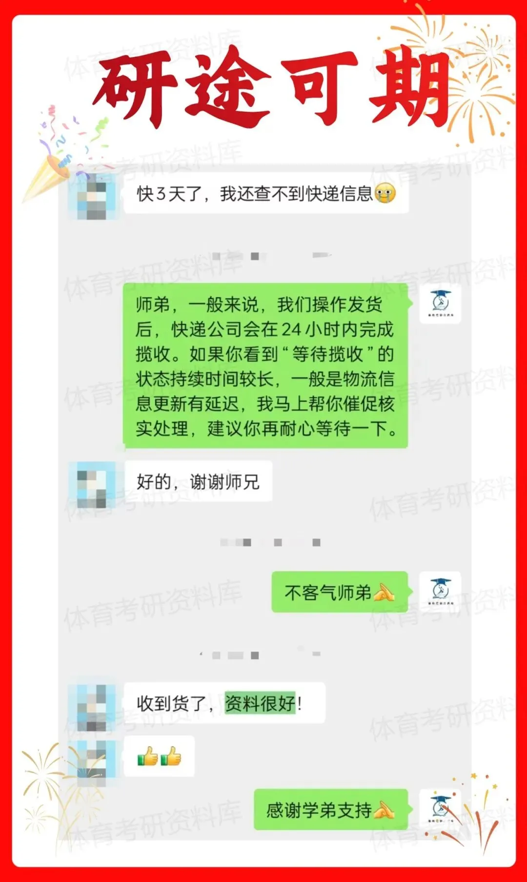3、关于售后,资料每年都会更新,所有售后期限为购买日至当年考研初试结束之日,往年资料不再享受今年售后服务,同时因个人原因若转让他人需要承接售后服务,请提前向体育学哥客服报备,否则我们将拒绝提供售后服务。