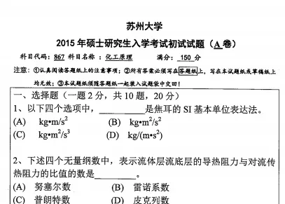 2015年苏州大学867化工原理考研真题试卷