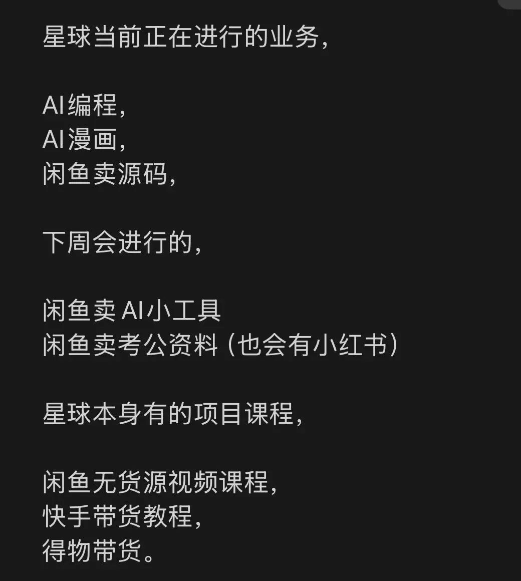 近期推进了多个业务,有AI漫画,AI编程,还有闲鱼卖源码,马上要开始的闲鱼AI小工具变现,闲鱼考公教育资料玩法。