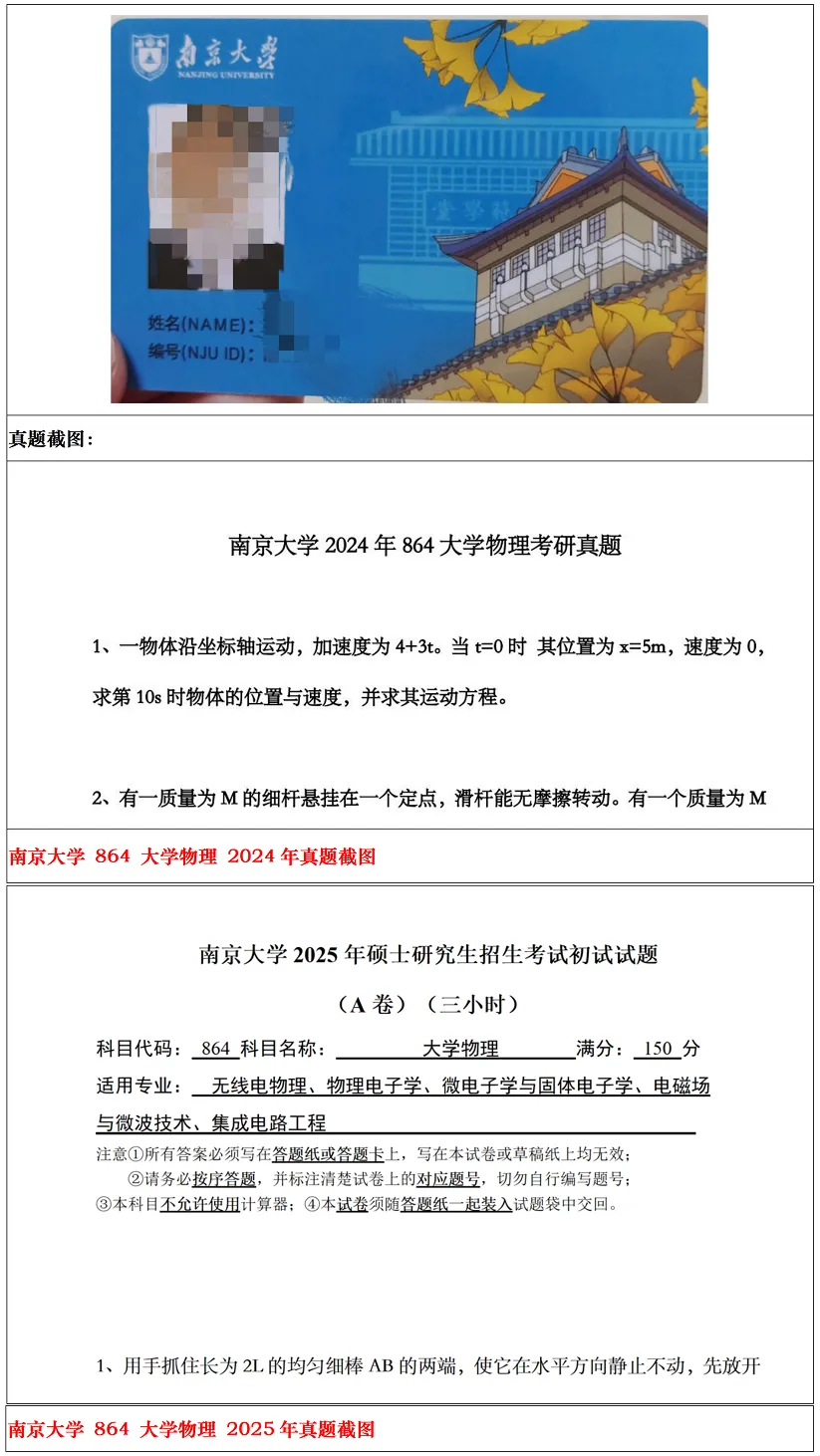 首先从考情来分析,今年南大电子学院考864的专业有电磁场,物理电子学,微电子固体物理,本部集成等等,涉猎范围还是非常广的。在25考研之前864的难度一直都是中规中矩,每一年的平均分均能达到125+,但25考研那一年突然改变出题风格,考察了一些在考纲范围内但是基本没考过的知识点,导致平均分直接下降到100左右,26考研也是如此,虽然平均分略有上升,但还是回不到当年均分130的好时候。下面是大物的题型分布,值得一提的是,南大老师对于大物的过程分给的相当多,我考完自己估分115左右,结果出来120+。大家放心冲!