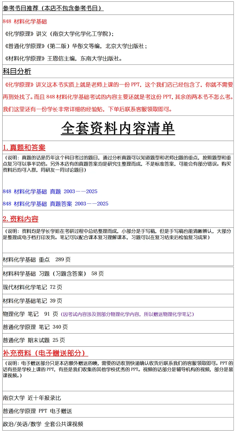总体来讲,848对考研生的化学和材料素养要求比较高,高分非常难,复习也需要在吃透真题的同时发散知识点。不过848题目不难,在学完ppt,用笔记补充资料没有的考点,吃透真题的情况下,848保底是有100分的。这门专业课不像其他学化工原理或者专门考物化的学校一样光刷课刷题就花了很多时间,如果和我一样不看课自学的情况下,确实可以节省很多时间学习公共课。最后,如果27年的试卷变化很大,在考场上一定要稳住心态,今年大家近乎裸考,但是认真准备的人起码能把物化和无机化学中重复的部分(如电池,热力学,晶体结构等)写对,还有一些基础的无机化学知识题也能对。我当时考场上就只能确定8道选择题一定是对的,六道大题就两道会,剩下四道都是依据自己的素养和印象分析的,最后也拿了接近120的高分(在今年基本上是最高的一批)。培养好心态,争取每一课都不拖后腿,过了复试线15—20分基本上就胜利了。
