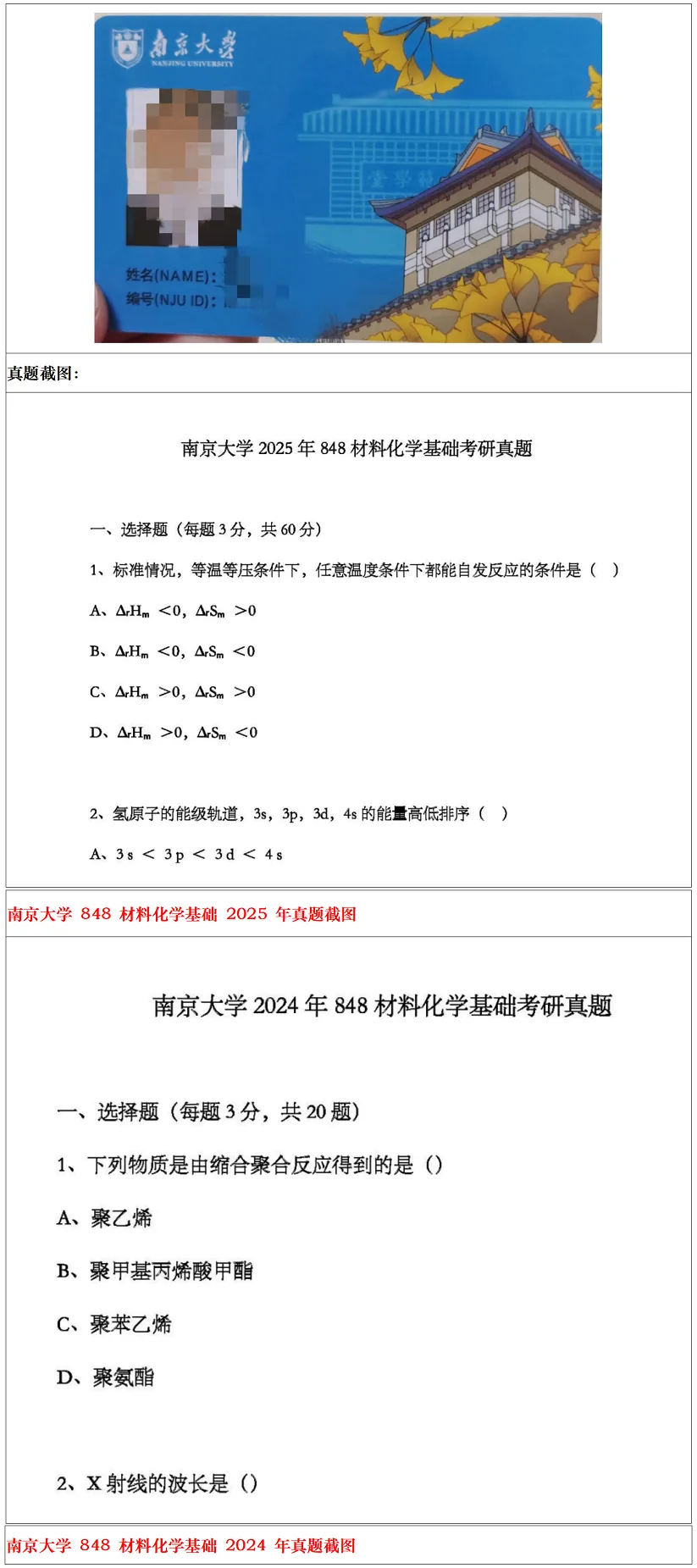 大家好,我是22级应届报考南京大学现代工程与应用学院材料与化工专硕的考生,专业课考试科目为848。本次很幸运以初试前五的成绩上岸,在此我想向大家分享一下我上岸的学习经验。