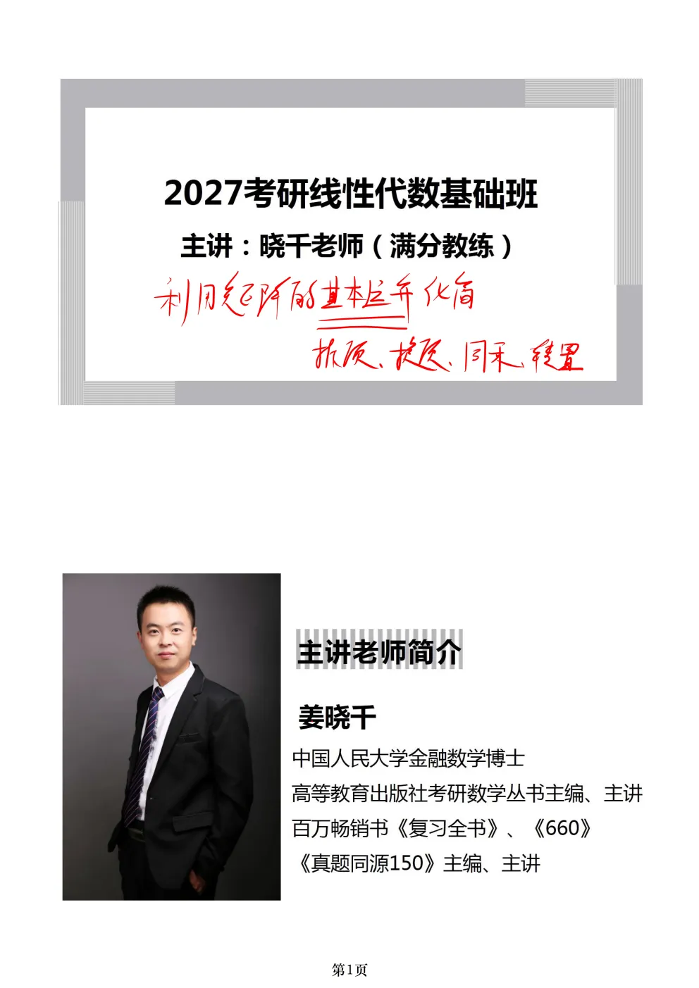 本资料为考研数学姜晓千老师《线性代数基础讲义+同步笔记》完整高清电子版PDF。全书系统覆盖行列式、矩阵、向量、线性方程组、特征值与特征向量、二次型等考研线代全部核心考点,讲义与同步笔记配套使用,知识点梳理清晰、例题精选典型,适合基础阶段系统学习,纯净无水印可打印!